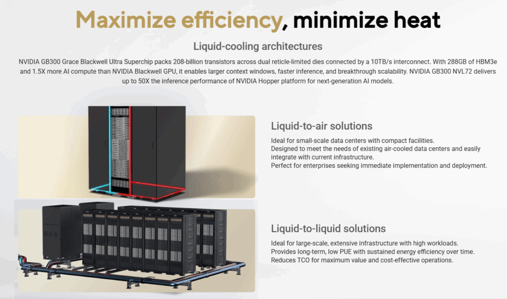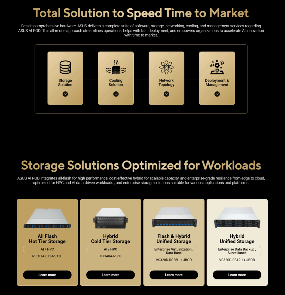 Sveobuhvatan dizajn infrastrukture – Kako bi ispunio zahteve savremenih data centara u pogledu snage, termalne efikasnosti i skalabilnosti, sistem poseduje kompletan infrastrukturni dizajn koji integriše tečno hlađenje,uravnoteženu arhitekturu skladišta podataka i modularnu mrežnu topologiju.Unutar 48U NVIDIA MGX kompatibilnog rack-a, uključeno je devet NVIDIA NVLink switch tacni i 18 računarskih tacni, uz manifold-bazirano hlađenje koje obezbeđuje predvidljive performanse, jednostavno servisiranje i dugoročnu održivost. Dodatno, ASUS rešenja za skladište nude fleksibilne konfiguracije koje zadovoljavaju različite tipove radnih opterećenja — od all-flash hot-tier skladišta za AI i HPC, do hibridnih i unifikovanih sistema za upravljanje podacima u preduzećima, backup i skalabilnost. Ova prilagodljivost omogućava korisnicima da izgrade uravnotežene infrastrukture optimizovane za performanse, efikasnost i buduće operativne potrebe.