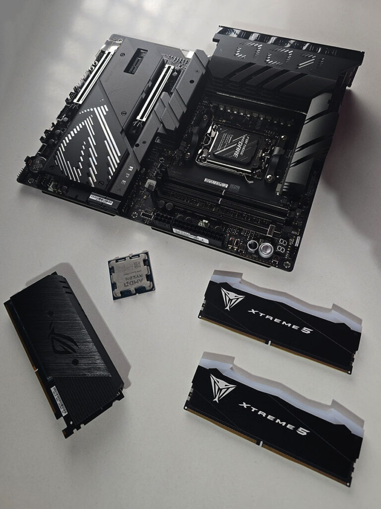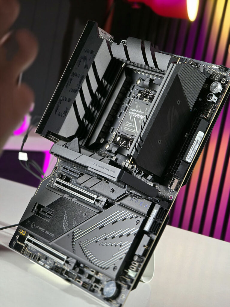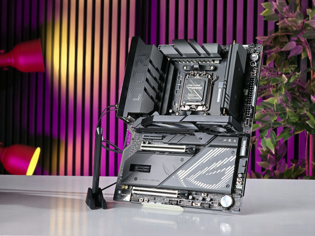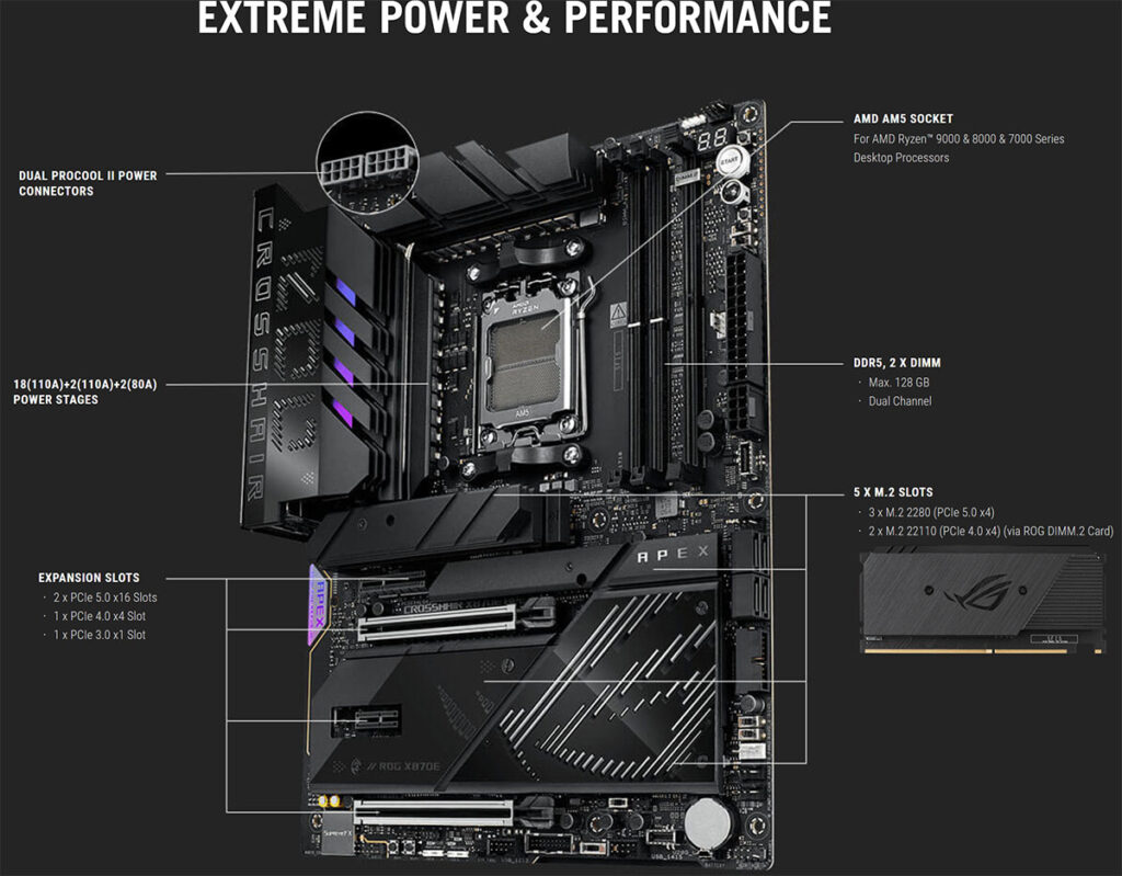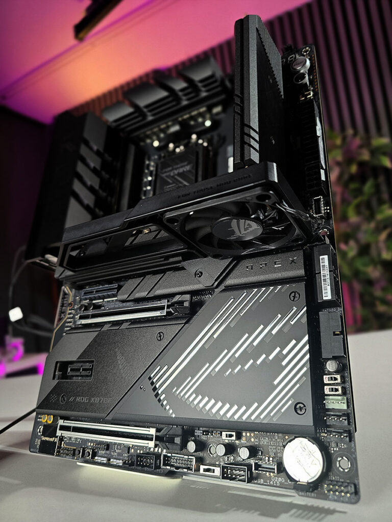 Standardnih je ATX dimenzija ali sve bitno je skladno spakovano na nju. Podržani su procesori AMD 9000, 8000 i 7000 serije. Hladnjaci su masivni i crne boje a tu je i lepo brendiran backplate. Ploča je poprilično teška, što bi se reklo nije se štedelo na hladnjacima jer ipak je ovo oveklokerski san pa prilikom zahtevnih sesija treba i ohladiti naponsku jedinicu koju čine 18+2+2 faze. Za napajanje procesora tu je 2x 8pin EPS, dok ispod 24pinskog konektora imamo dodatni PCIe 8pin kako bi osigurali stabilan rad prilikom visokih klokova. Prvi slot bliže procesoru je rezevisan za M2 5.0 standarda dok su ostala dva ispod hladnjaka na kome se oslikava ROG logo.