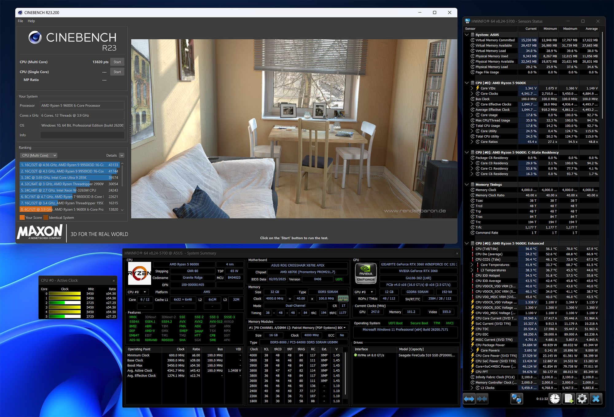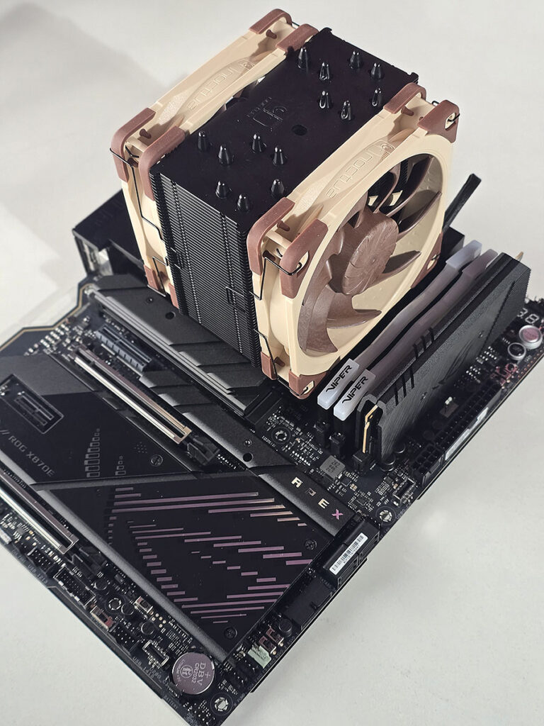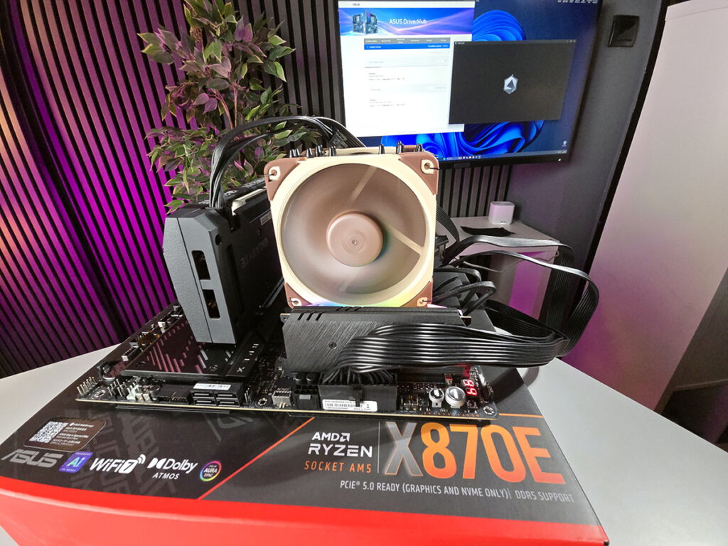 Ja na žalost na testu koristim CPU AMD Ryzen5 9600X iz mojih fondova, ali čisto ću se malo poigrati i videti da li i kako on radi na ovoj ploči. Za hlađenje tu je Noctua a RAM je Patriot Viper na 8000Hz. Instalacija protiče glatko, rezultat u Cinebench R23 nije neki vredan pomena ali je vredno pomena to da sam sa ovakvim PCU uspeo bez problema da setujem RAM na 8000Mhz i da prođem test sa tim podešavanjima.