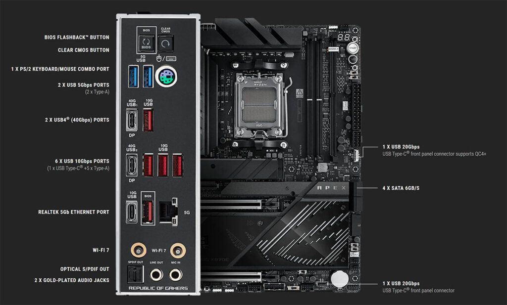 Zadnji I/O panel nije pretrpan ali za ovakav tip matične ploče po meni ima i više nego potrebnih konekcija. Na dnu su konektori za zvučnu kartu, odmah iznad brzo spojiva WiFi7 antena, nekoliko USB Typ-C i 3.0 standarda, 5 gigabitni lan konektor, još dva USB TypeA slota i nešto što se ne viđa često a što bi se smatralo zastarelim a to je PS2 konektor za tastaturu i miš. Ovo je zato jer se ponekad u okviru OC sesija gase PCie linije kao i USB zarad boljih rezultata pa je najlakše priključiti analogno tastaturu ili miš i komandovati. Iznad toga su dva tastarera za BIOS.