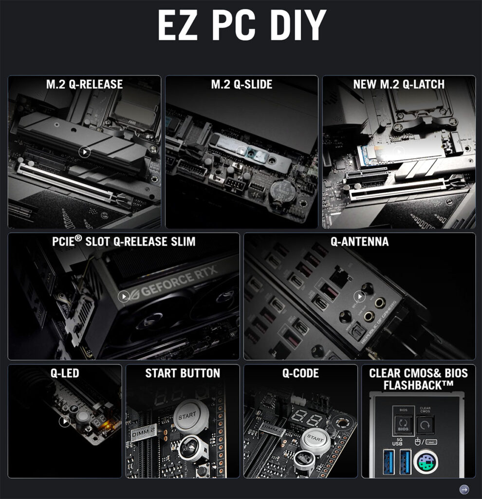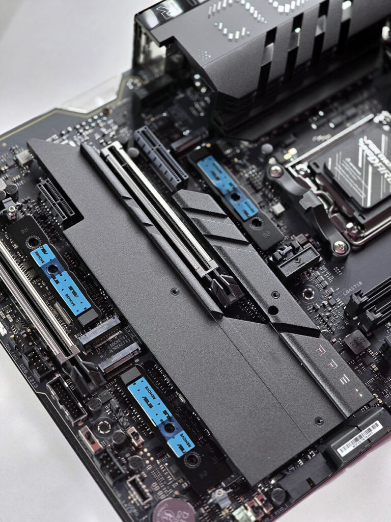 Kad smo kod grafičke karte ono što upada u oči je pozicija prvog PCIe 16 5.0 slota a to je tek treći po redu od procesora. To je urađeno tako u slučaju da korisite velike hladnjake sa obe strane grafičke karte, ili POT za njih koji je takođe glomazan i kako ne bi došlo do sudaranja između komponenti. Oba PCIe slota imaju quick diskontekt funkciju koja omogućava brzo skidanje grafičkih kartica bez dodatnih dugmića a sami slotovi imaju dodatna ojačanja.