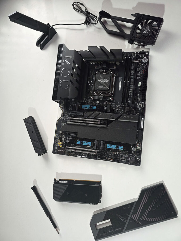 U standardnoj ROG kutiji se pored matične ploče nalaze sve potrebne sitnice za instalaciju M2, zatim WiFI7 antena, ROG Dimm2 karta za još dva m2 uređaja i nosač ventilatora veoma atraktivnog izgleda kojim možemo dodatno hladiti DDR5 memoriju.