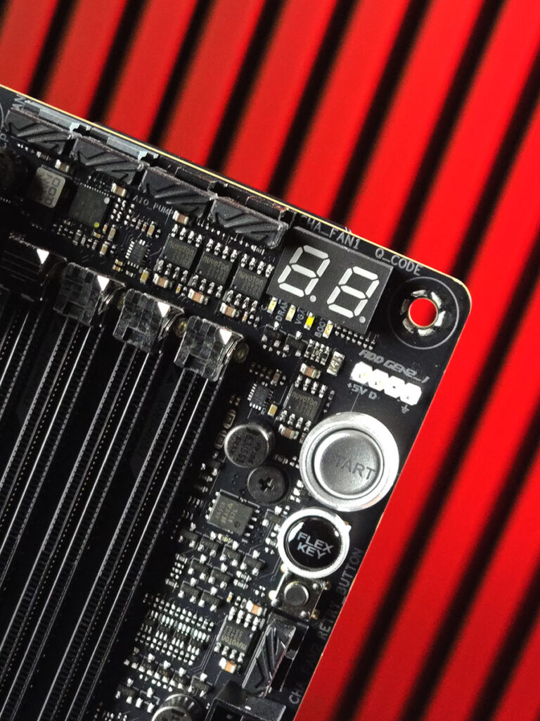Desno se nalaze 4 ojačana DDR5 DIMM slota (do ~9 GT/s) brojni fan headeri za ventilatore i AIO pumpe Debug displej, Start i Reset tasteri