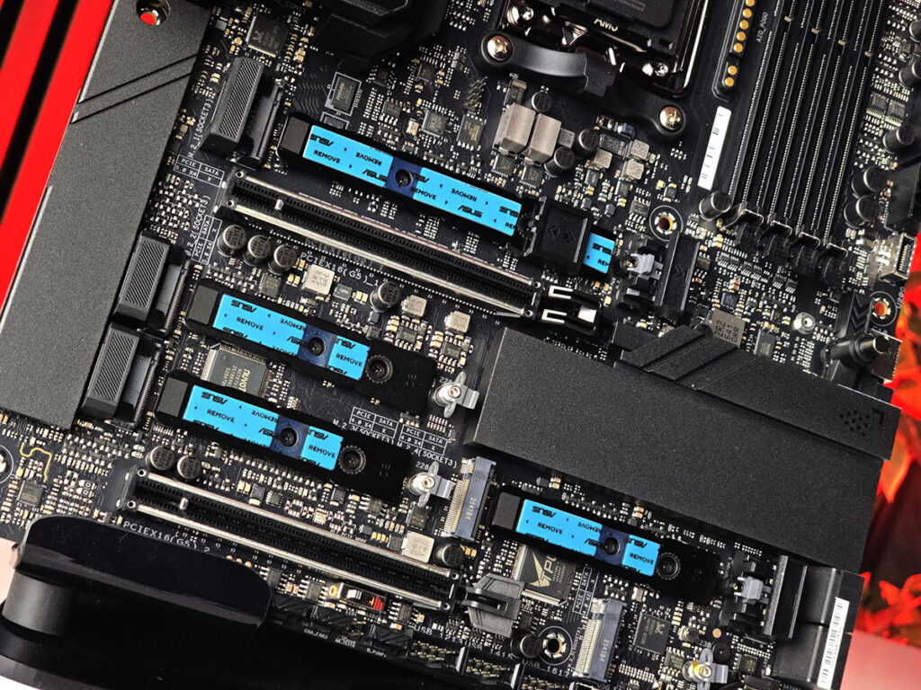 Prvi M.2 slot ima veći hladnjak sa heatpipe-om, dok je ispod njega još jedan masivan hladnjak za ostale M.2 uređaje. Svi hladnjaci se lako skidaju i otključavaju polugicom sa desne strane.
