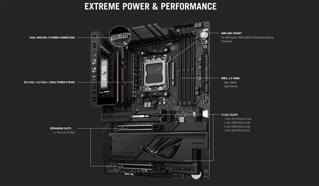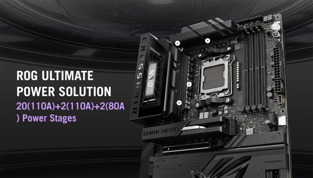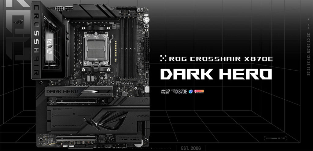 Asus ROG Crosshair X870E Dark Hero je matična ploča ATX standarda, a puni X870 čipset sigurno obezbeđuje vrhunske performanse u Hi-End konfiguracijama.