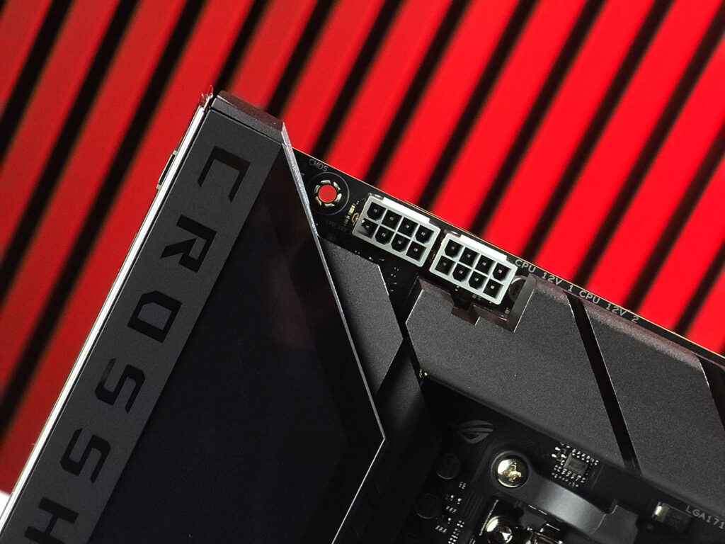 Hladnjaci na 20+2+2 naponskoj sekciji su masivni, crne boje, sa jasno istaknutim Crosshair nazivom. Pored njega se nalazi zatamnjeno staklo ispod kog je Polymo Lighting II osvetljenje koje, uz slojevite kristalne premaze i RGB efekte, stvara više različitih prikaza — veoma zanimljivo rešenje.