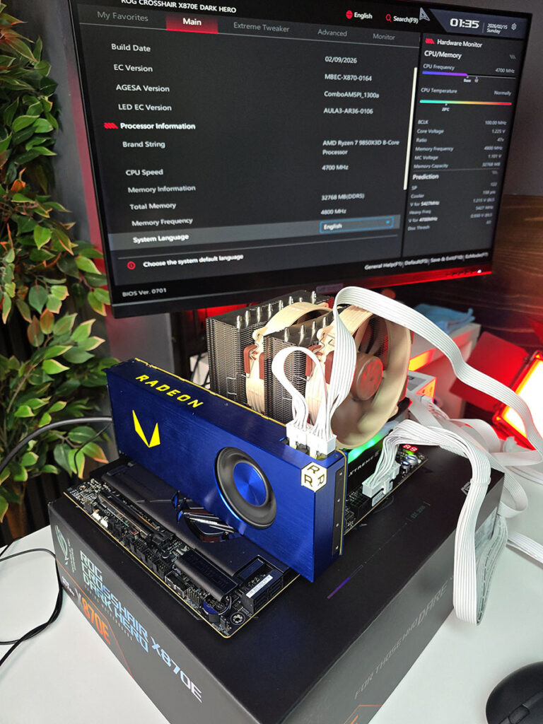 Već na prvi pogled jasno je da su ovo premium ploče namenjene najjačim procesorima — punokrvni čipset, odlične naponske sekcije, kao i najnovije konektivne i druge tehnologije koje jedna ovakva ploča treba da poseduje, uključujući i veliki kolor displej kod Glacial modela. Na testu je danas Dark Hero model, a stigao je i najnoviji Ryzen 7 9850X3D procesor — tako da odmah prelazim na stvar.