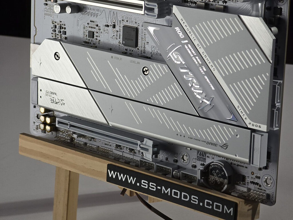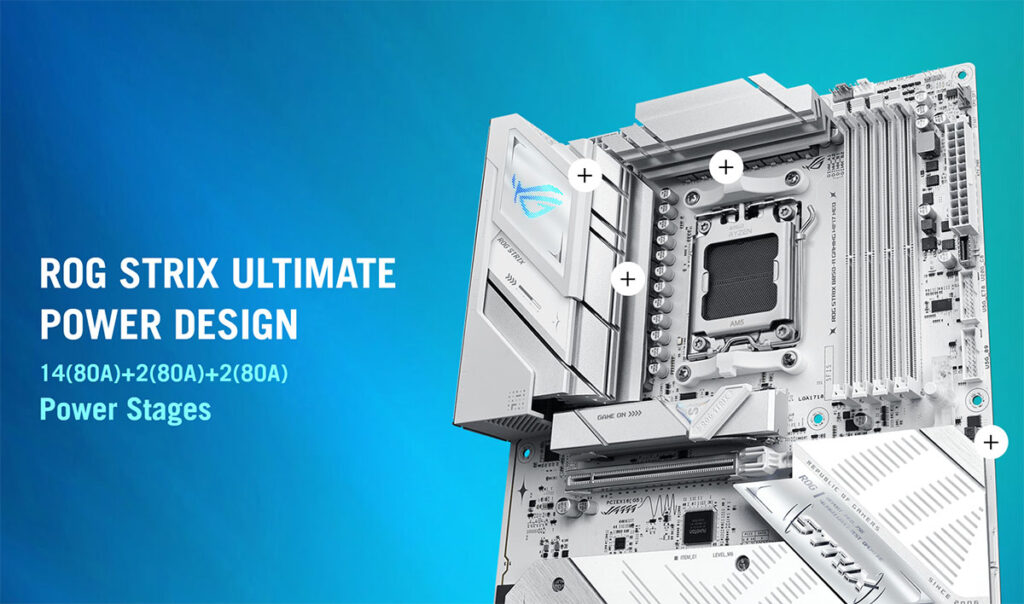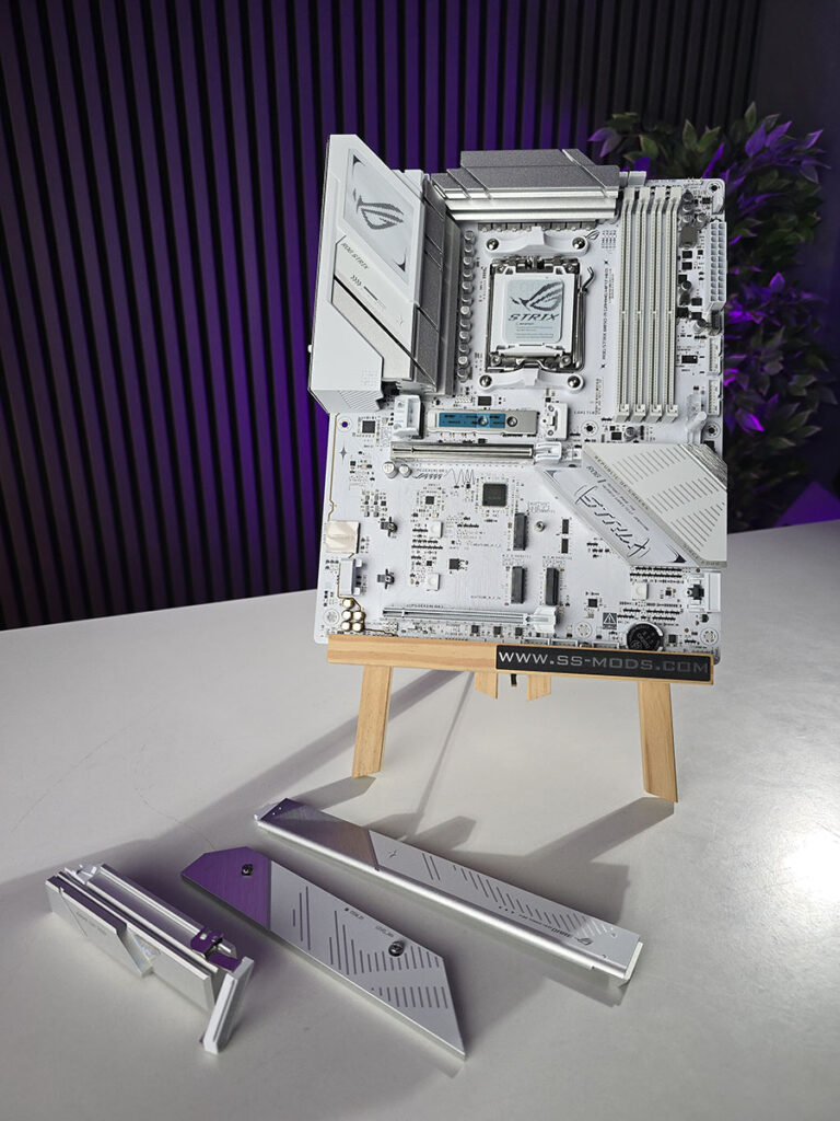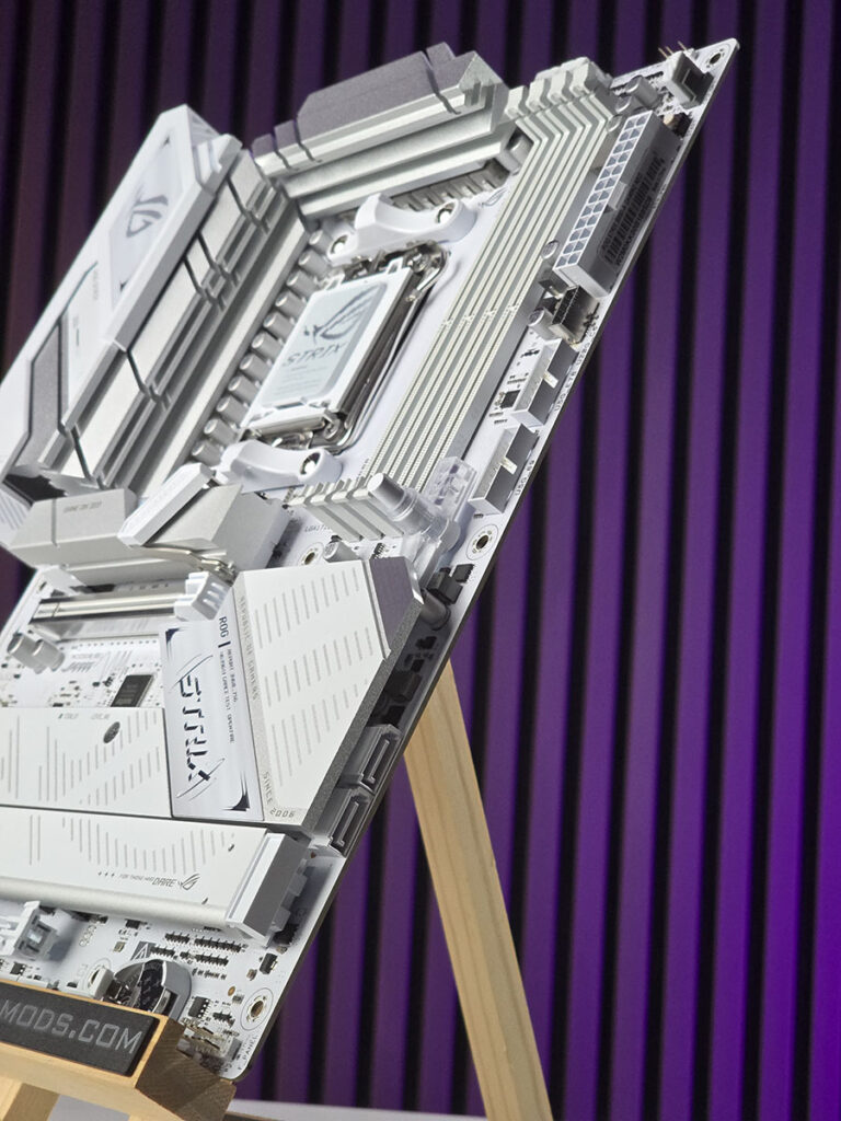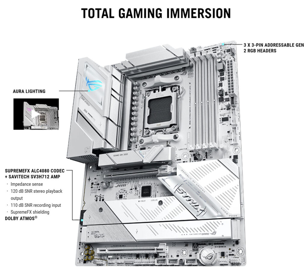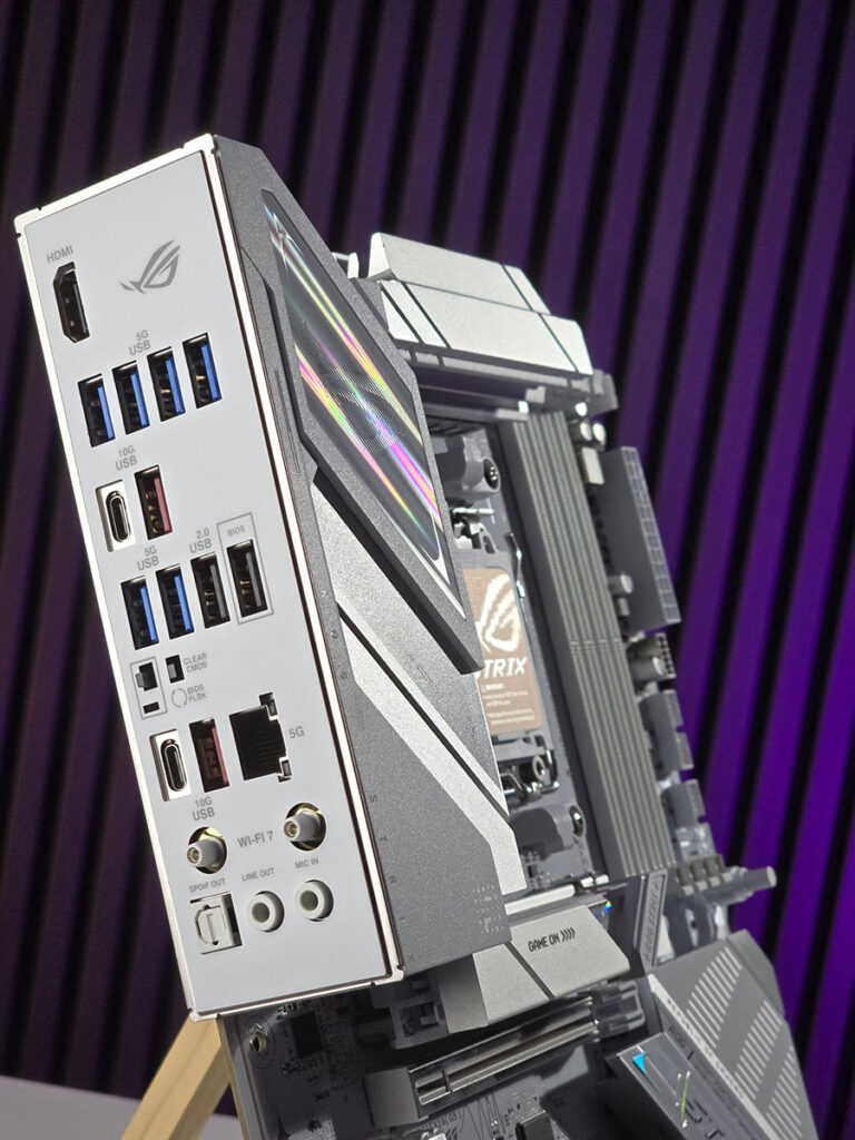 Već na prvi pogled jasno je da je u pitanju ploča iz ROG porodice. Dominantna bela i srebrna estetika, uz prepoznatljive ROG grafičke detalje, čini je idealnim izborom za svetle ili potpuno bele konfiguracije. Veliki aluminijumski hladnjaci pokrivaju: VRM sekciju, sve M.2 slotove, deo čipseta. Time se postiže efikasno pasivno hlađenje i stabilan rad čak i pod velikim opterećenjem. RGB osvetljenje je diskretno i može se kontrolisati kroz ASUS Aura Sync softver, što omogućava sinhronizaciju sa ostatkom ROG ekosistema.