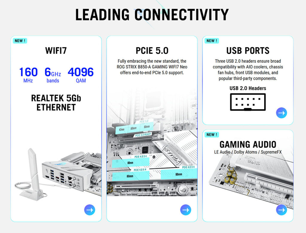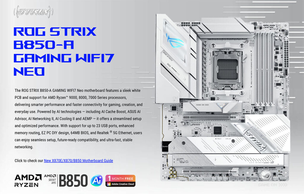 Kompanija ASUS kroz svoju Republic of Gamers liniju već godinama razvija matične ploče namenjene gejmerima i entuzijastima, a model ROG Strix B850-A Gaming WiFi NEO predstavlja jedan od najzanimljivijih predstavnika nove generacije AM5 platforme. Bazirana na B850 čipsetu, ova ploča donosi podršku za najnovije procesore iz porodice AMD Ryzen 9000 Series ali i kompatibilnost sa prethodnim generacijama AM5 procesora. Uz podršku za DDR5 memoriju visokih frekvencija, PCIe 5.0 skladište i najnovije mrežne standarde poput WiFi 7, jasno je da je reč o ploči koja cilja moderne gejming konfiguracije. Pored tehničkih karakteristika, Strix serija je poznata i po prepoznatljivoj estetici, a B850-A model donosi elegantan beli dizajn koji je sve popularniji među entuzijastima.
