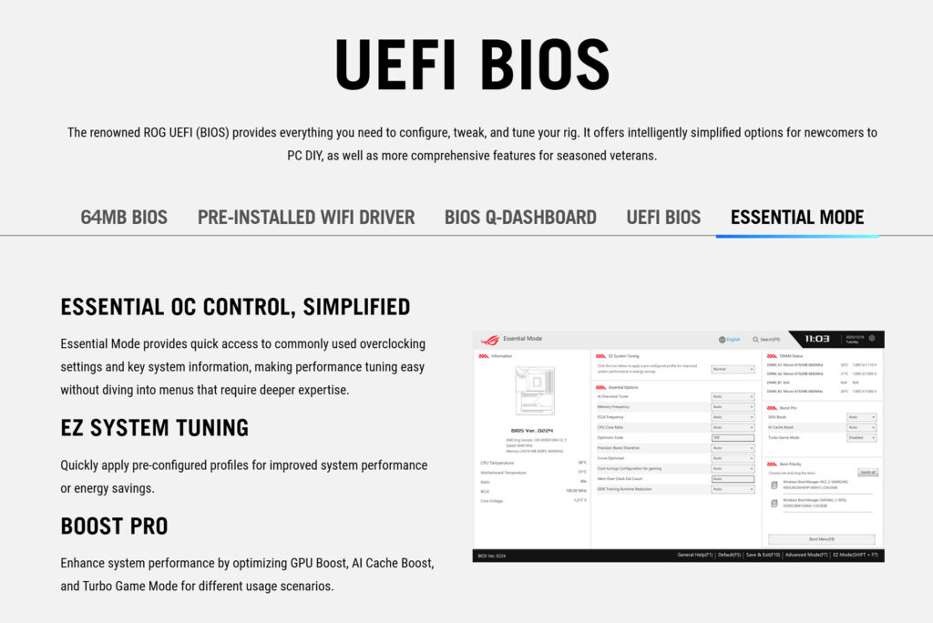 Za napredne korisnike i servisiranje sistema ASUS je implementirao i dodatne funkcije BIOS FlashBack dugme – omogućava ažuriranje BIOS-a bez procesora ili memorije i Clear CMOS dugme – brzo resetovanje BIOS podešavanja mreža i konektivnost. ASUS tradicionalno nudi jedan od najboljih BIOS interfejsa u industriji. ROG UEFI BIOS dolazi sa dva režima rada EZ Mode za brza podešavanja sistema i monitoring i Advanced Mode za detaljna podešavanja poput overclockinga, napona procesora i memorije, kontrole ventilatora, optimizacije performansi. Za entuzijaste ovo znači potpunu kontrolu nad sistemom.
