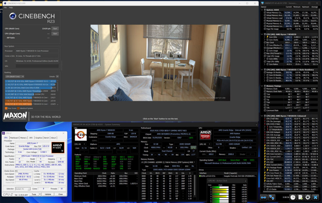 Moram priznati – VRM koji čine 16+2+2 faze deluje dovoljno ozbiljno za ovaj Ryzen procesor. Testirao sam je pod punim opterećenjem u Cinebench R23 programu, gde su temperature i naponi bili vrlo korektni. Nema throttle-a, nema nestabilnosti, a rezultati su adekvatni ovom procesoru i njegovim performansama. Bukvalno skoro pa identični kao kod jačeg X870 modela.