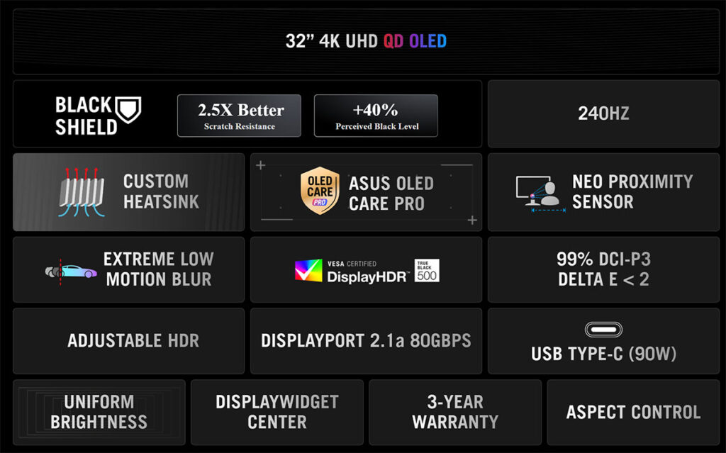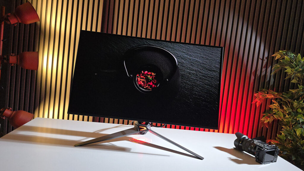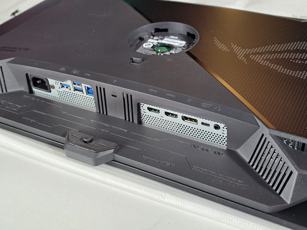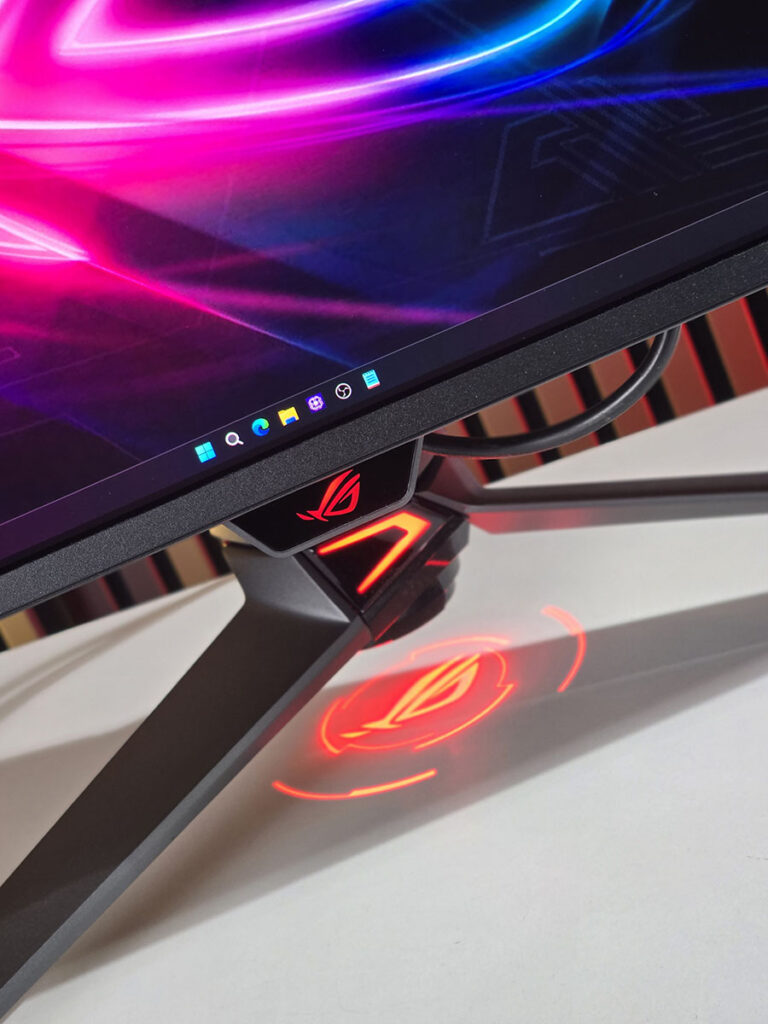Da se vratimo na ekran, u pitanju je QD-Oled 4 generacije, Delta E<2, 10-Bit panel sa 99% DCI-P3 standardom, poseduje VESA Display HDR 500 uz jako tanke basele osim sa donje strane gde imamo lajsnu ispod koje je dodatak za senzor i ROG logo koji takodje ima iluminaciju. Iza ovog donjeg logoa se nalaze tasteri za upravljanje podešavanje kroz meni i to je već klasika na ROG ekranima ovog tipa. Za sšo bolju uskladjenost slike i FPSa u igrama tu su Nvidia G-Sync, AMD FreeSync premium PRO i AdaptiveSync Display240