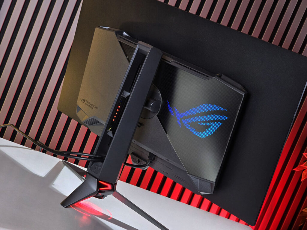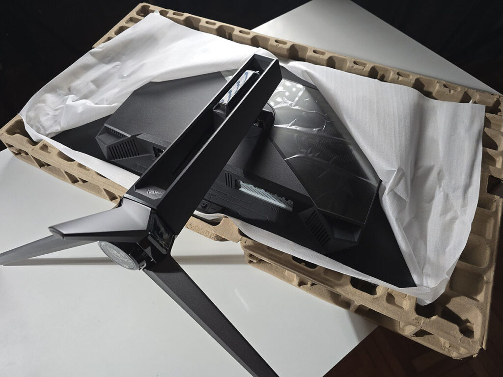 Kućište ekrana baš je tanko, izradjeno je od metala kao i stopa, sa zadnje strane je kutija za elektroniku naravno u ROG stilu, dobro je provetrena što smo videli na prethodnom modelu ovog ekrana i poseduje ROG logo koji je i RGB osvetljen. Poedešavanje osvetljenja možete štelovati kako kroz AURA softver tako i kroz meni na samom ekranu