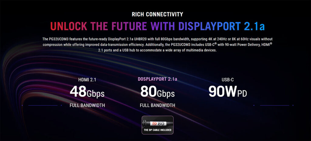 Da vidimo šta sve dolazi u kutiji, tu su vrat, stopa, monitor, kablovi ali i jedan veoma bitan kabl koji dolazi u paketu DisplayPort 2.1 UHBR20 koji može postići prenos do 80Gbps, naravno tu je i HDMI 2.1 kao i USB Type-C koji pored prenosa slike može služiti i za punjenje uredjaja do maximalnih 90w potrošnje što čini većinu današnjih laptopova i NUC uredjaja. Maramica za čišćenje, uputstvo, nalepnice i to je to.