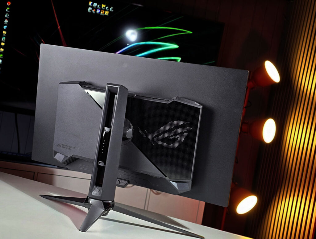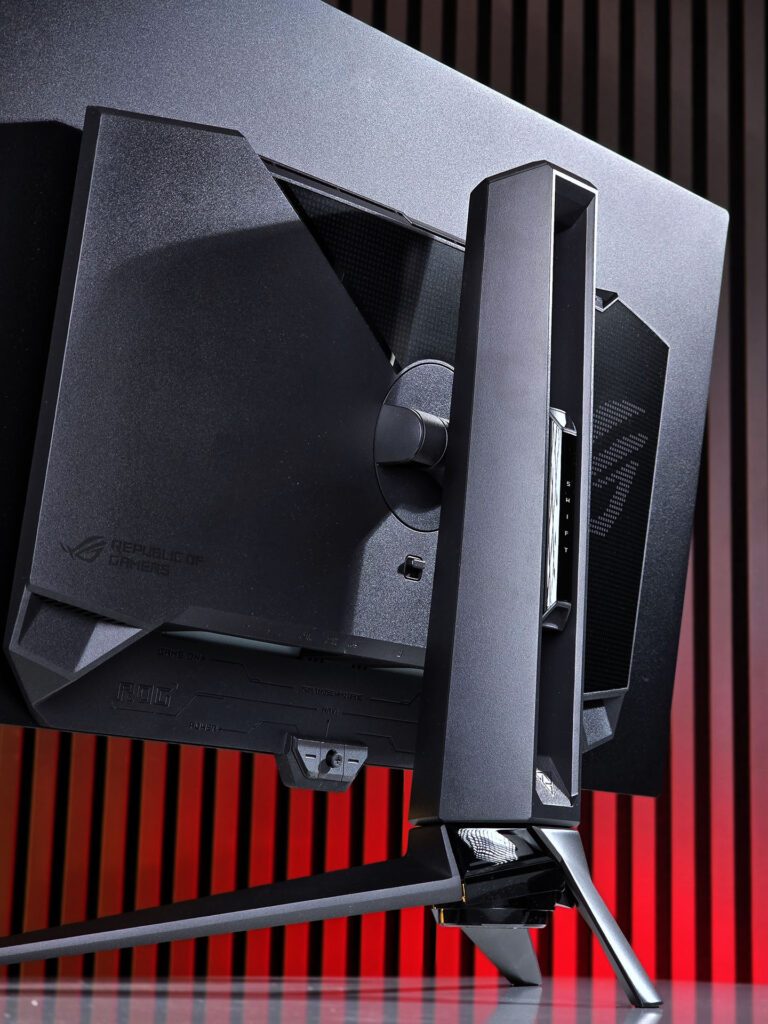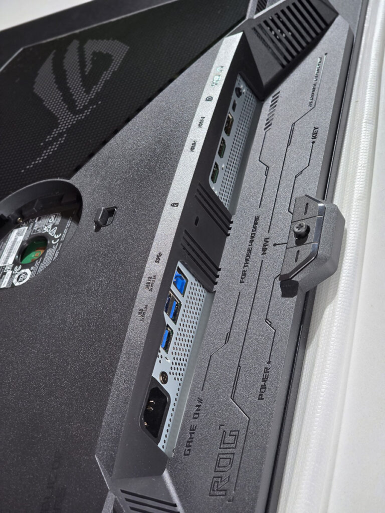 Kućište ekrana baš je tanko, izradjeno je od metala kao i stopa, sa zadnje strane je kutija za elektroniku naravno u ROG stilu, dobro je provetrena što smo videli na prethodnom modelu ovog ekrana i poseduje ROG logo koji je i RGB osvetljen. Poedešavanje osvetljenja možete štelovati kako kroz AURA softver tako i kroz meni na samom ekranu