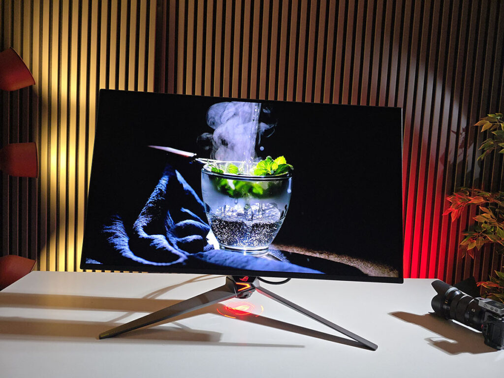 Ergonomija takodje na vrhunskom nivou, stalak je od metala, veoma lepe težine bas kakav i odgovara Swift seriji ROG monitora. Ekran se može rotirati u svim pravcima i podizati i spustati jako nisko ako zatreba, medjutim nema PIVOT opcije a kome još to i treba na ovakvom tipu ekrana orijentisanom za gaming upotrebu. Tu je i RGB efekat u samom stalku koji moze oslikavati logotip ili vaš lični pečat na stolu ispod monitora.