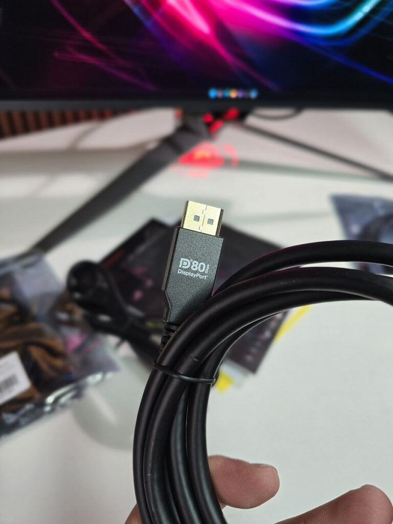 Da vidimo šta sve dolazi u kutiji, tu su vrat, stopa, monitor, kablovi ali i jedan veoma bitan kabl koji dolazi u paketu DisplayPort 2.1 UHBR20 koji može postići prenos do 80Gbps, naravno tu je i HDMI 2.1 kao i USB Type-C koji pored prenosa slike može služiti i za punjenje uredjaja do maximalnih 90w potrošnje što čini većinu današnjih laptopova i NUC uredjaja. Maramica za čišćenje, uputstvo, nalepnice i to je to.