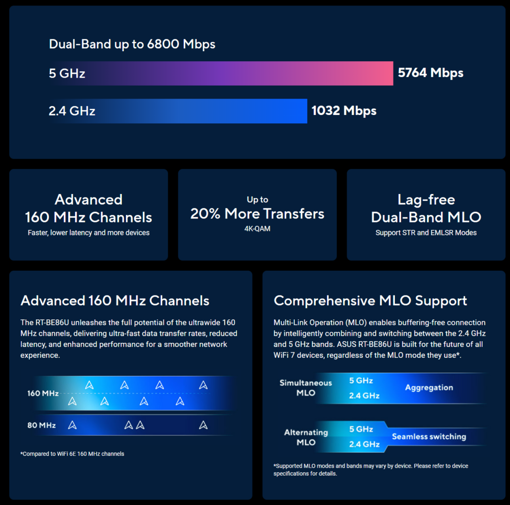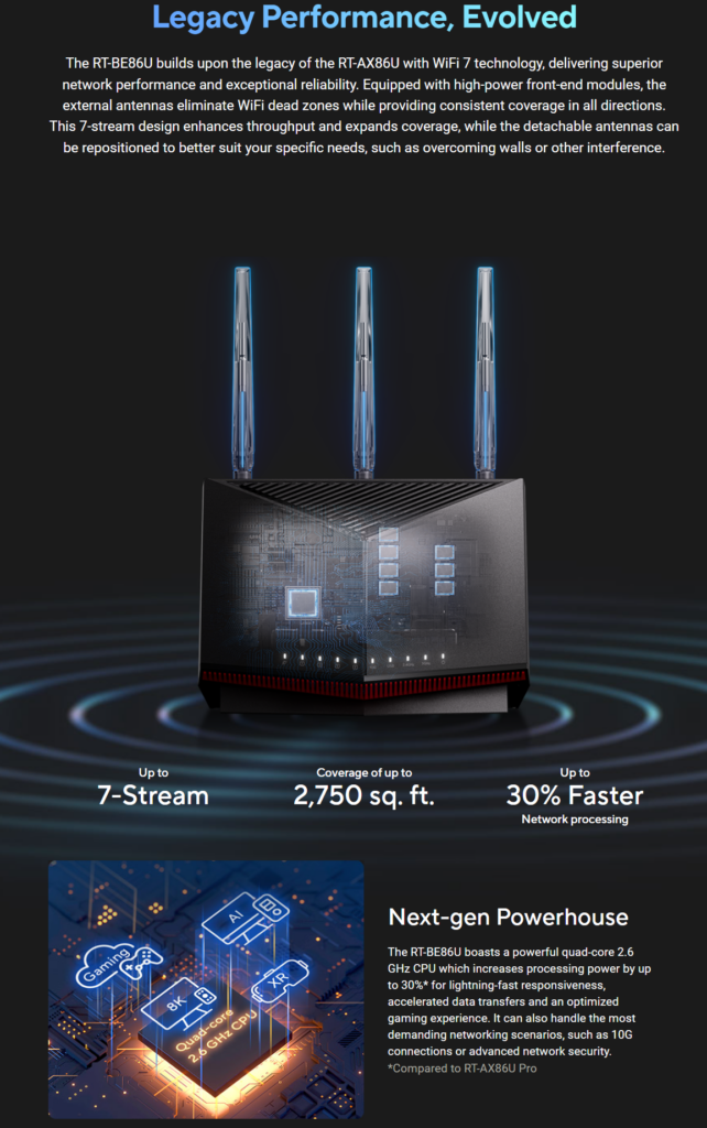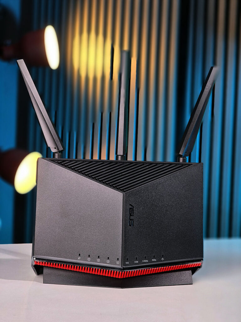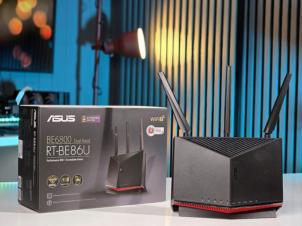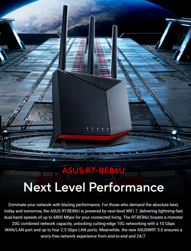 ASUS RT-BE86U je dual band wi-fi ruter koji podržava WiFi7 standard. Podržan opseg je kroz dve mreže 2.4Ghz kroz koju je podržan protok do maximalnih 1032Mhs i 5Ghz koji radi do maximalnih 5764Mbs, što mu zbirno daje brzinu do maximalnih 6800mbs. Za signal su zadužene 4 antene, od toga je jedna interna.