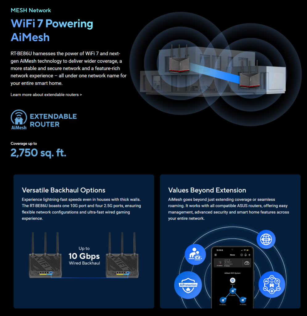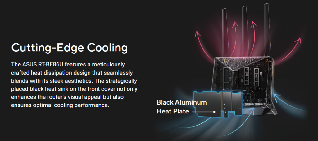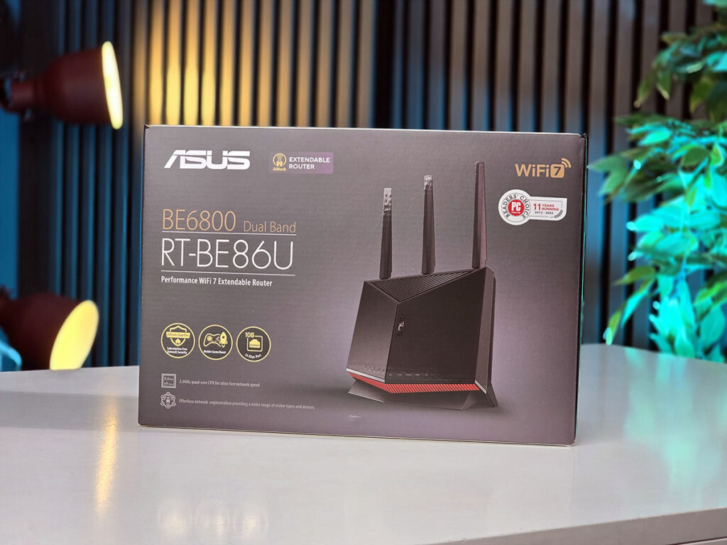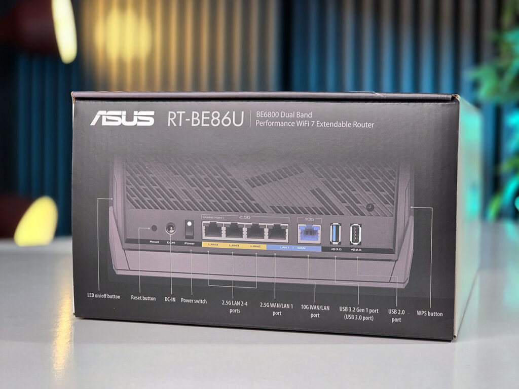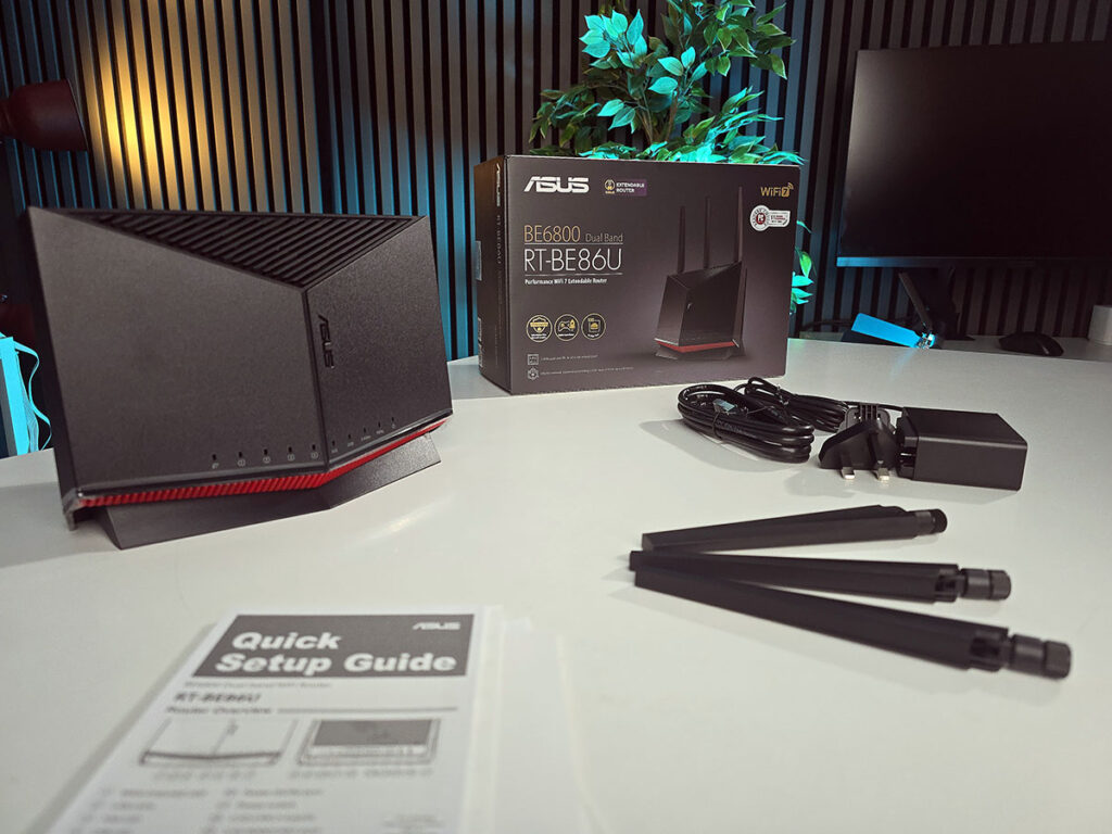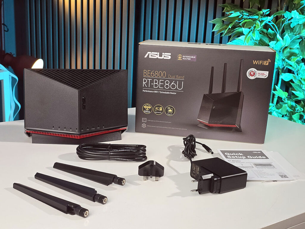 ASUS RT-BE86U je dual band wi-fi ruter koji podržava WiFi7 standard. Podržan opseg je kroz dve mreže 2.4Ghz kroz koju je podržan protok do maximalnih 1032Mhs i 5Ghz koji radi do maximalnih 5764Mbs, što mu zbirno daje brzinu do maximalnih 6800mbs. Za signal su zadužene 4 antene, od toga je jedna interna.