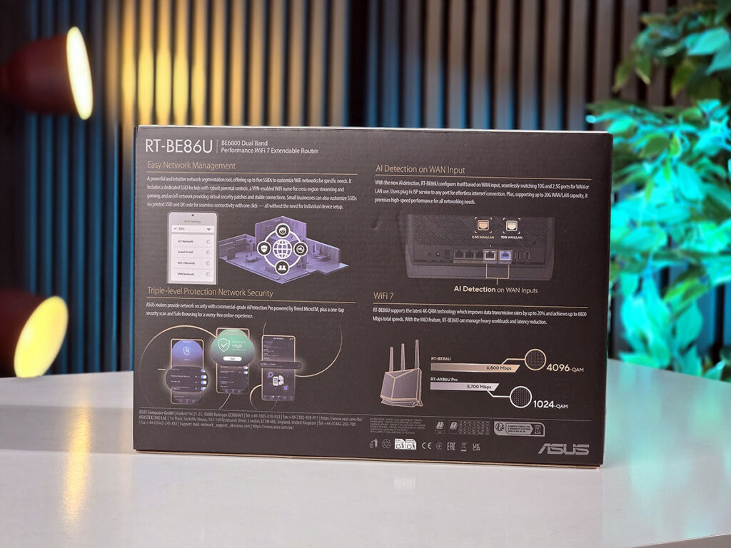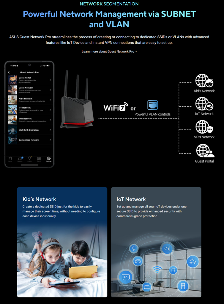 Softverski je ASUS RT-BE86U unapređen do maximuma, tu je i AI stručna podrška za razne stvari, određivanje prioriteta korisnicima, ograničavanje saobraćaja za maloletna lica ili onima koje vi to odredite a moguće je i odvojiti mrežu na dečju, LOT, VPN a moramo misliti i na posetioce pa je tu spreman i GOST segment. VPN je podrazumevan uz svaki Asus ruter pa je i ovde tako.