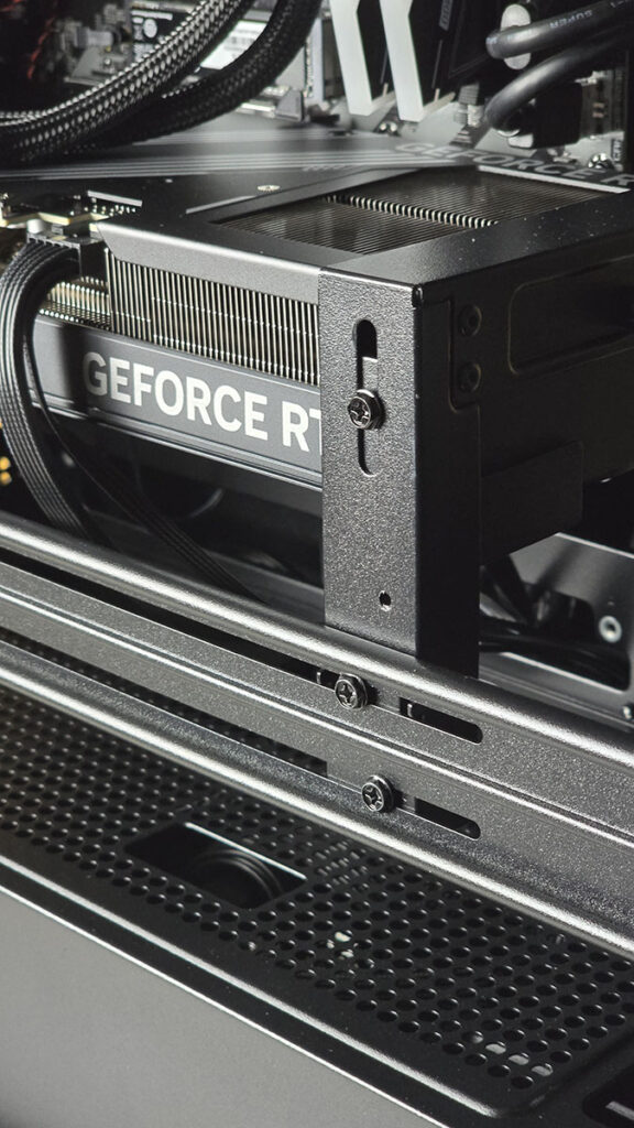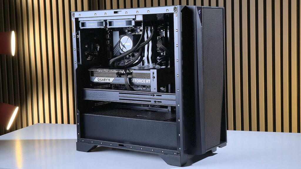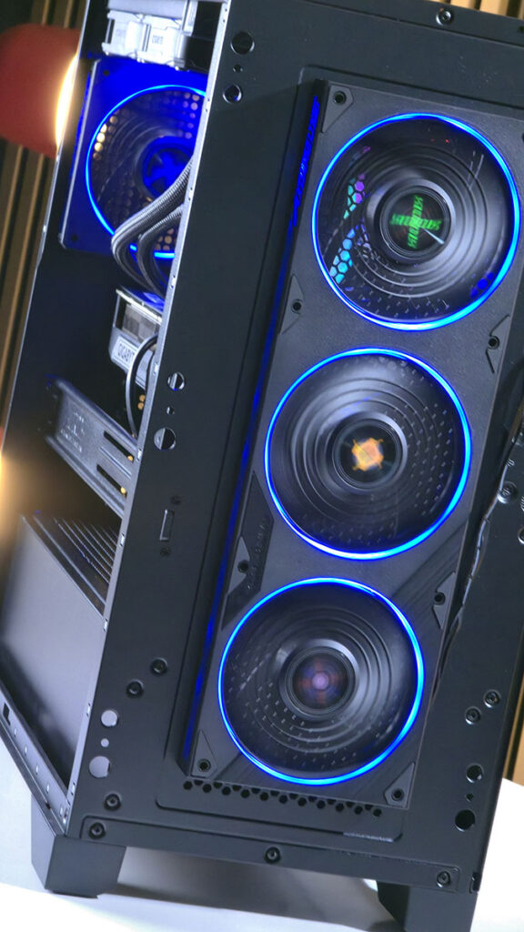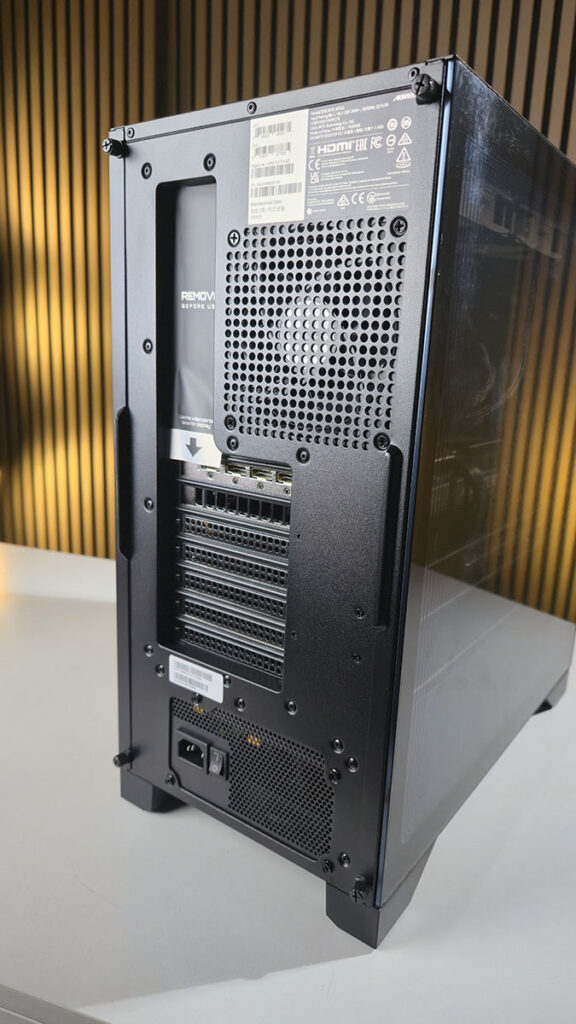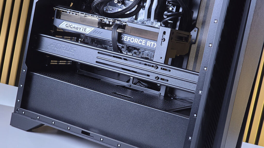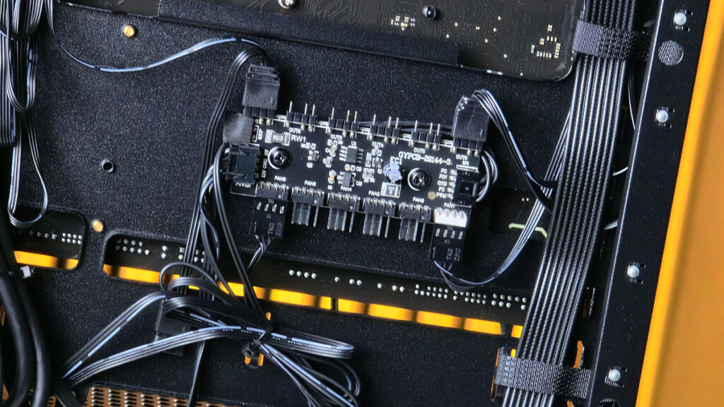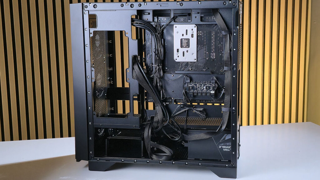 Što se tiče unutrašnjosti s obzirom na MID Tower segment i ugrađeni hardver prostora ima i više nego dovoljno. Kućište poseduje i specijalni nosač za GPU koji dodatno učvršćuje njenu poziciju što je izuzetno bitno jer se ovako izrađen računar celokupno transportuje pa je ovakav vid zaštite neophodan kako se hardver ne bi oštetio. Tacna za matičnu ploču podržava i STEALTH modele matičnih ploča koje imaju sve konektore orijentisane sa zadnje strane PCB-a, tako da u slučaju da jednog dana zaželite upgrade na tako nešto imate tu mogućnost. Na zadnjoj strani iza matične ploče imamo i preinstaliran FAN hub za kontrolu rada ventilatora. Tu je i nekoliko mesta za HDD i SSD uređaje pa i proširenje storage kapaciteta nije na odmet.