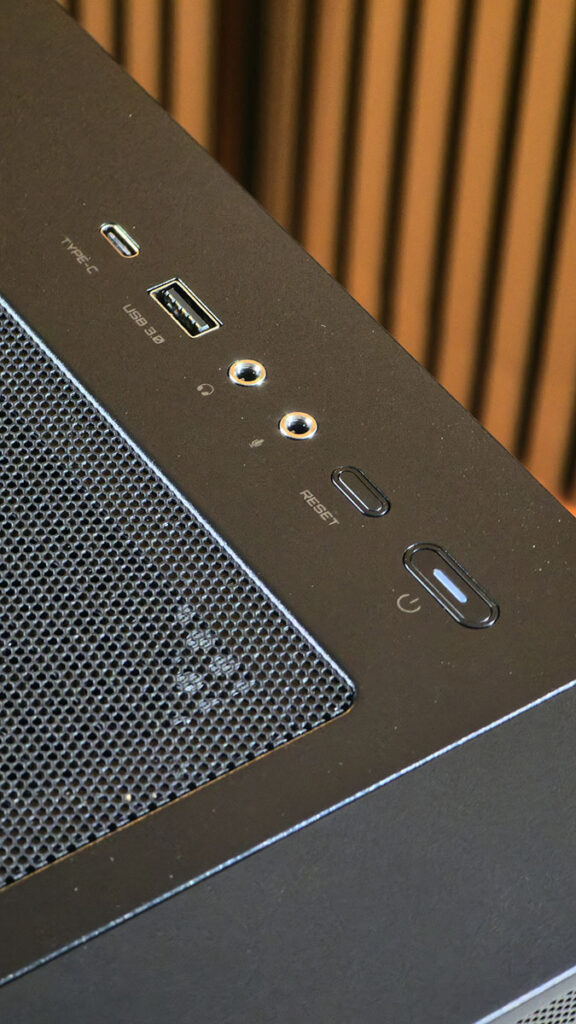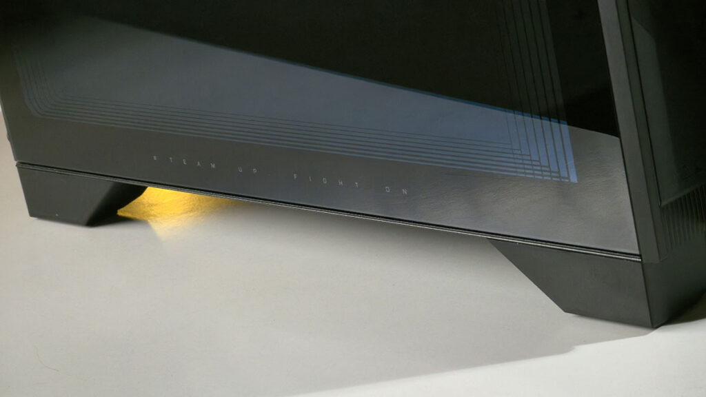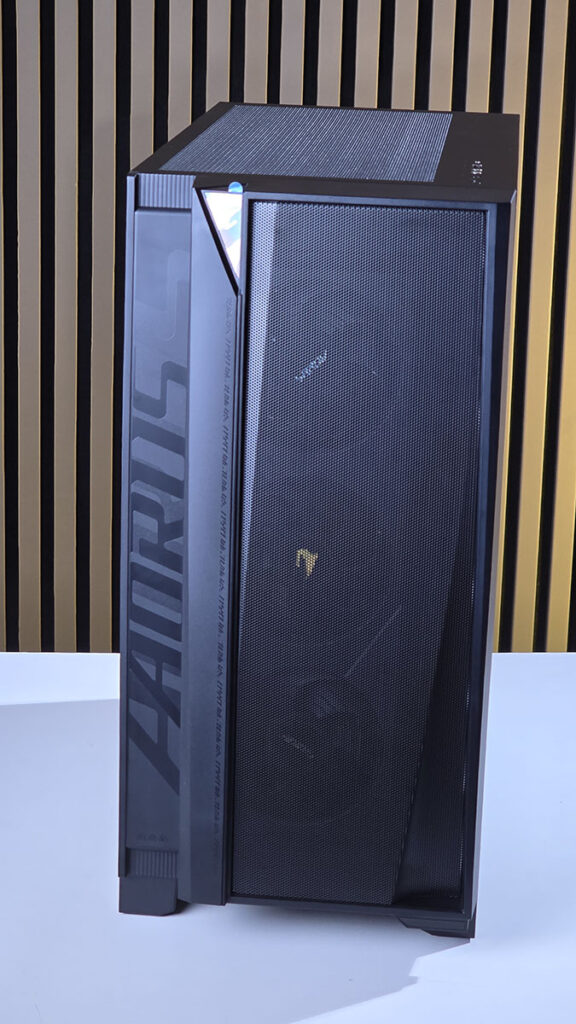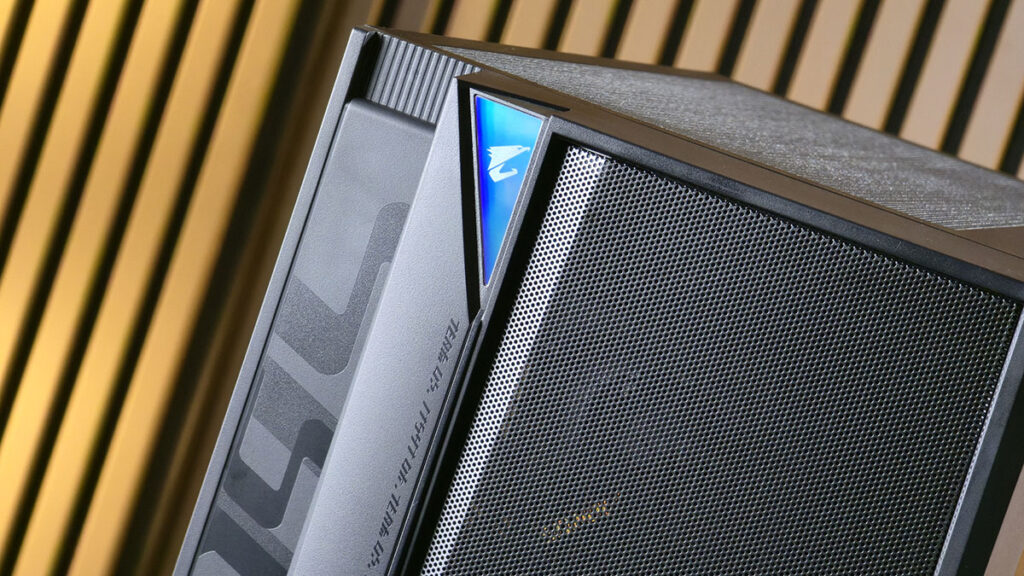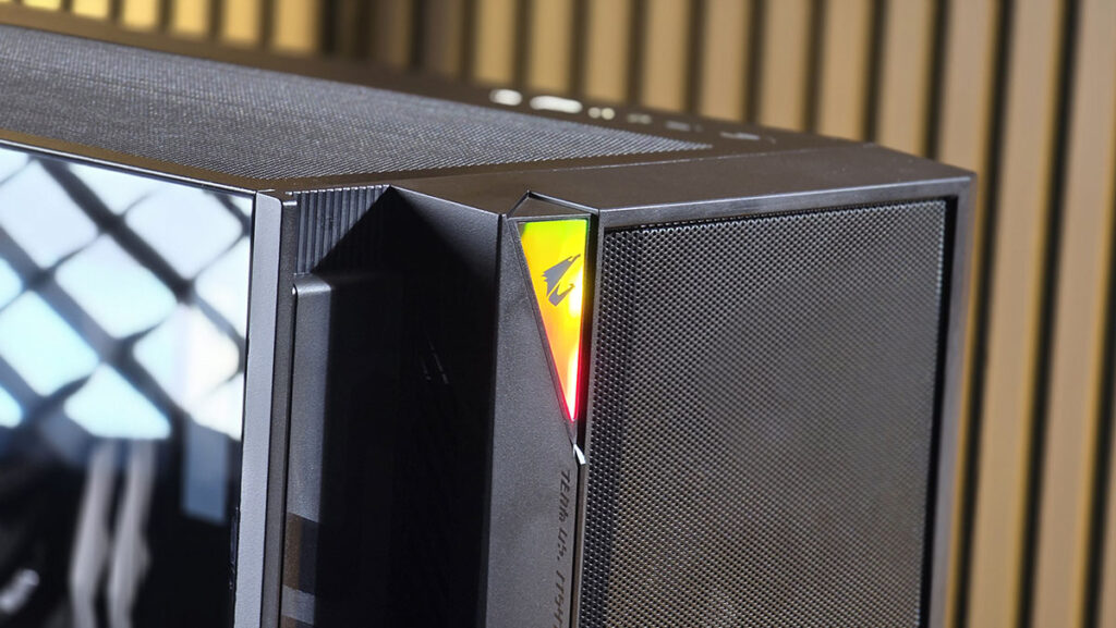 Sa prednje strane imamo lepo dizajniranu masku sa MESH mrežicom preko ventilatora, ukupno ih ima 3x 120mm i RGB su osvetljeni. Sa njene desne strane usek sa velikim natpisom AORUS, na vrhu tog preseka imamo AORUS logo koji nema RGB iluminaciju ali uz prelivanje svetlosti daje određeni ton. Na prvi utisak prednjica je dovoljno provetrena što je korak plus u hlađenju. Kućište se oslanja putem četiri izdužene pravougaone stope, ima gumenu podlogu tako da se kućište neće klizati po stolu. Sa gornje strane imamo predviđeno mesto za montažu do 3x 120mm ventilatora i takođe podršku za 360 radijator, dok je sa bočne gornje strane I/O panel koji pored start i reset tastera ima konektore za USB i audio, a tu je i magnetni filter za zaštitu od prašine.