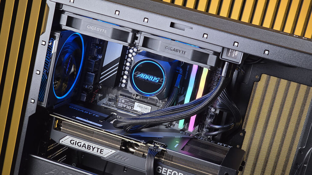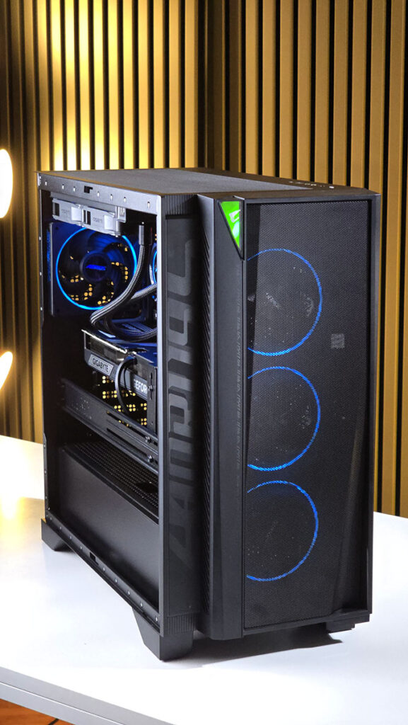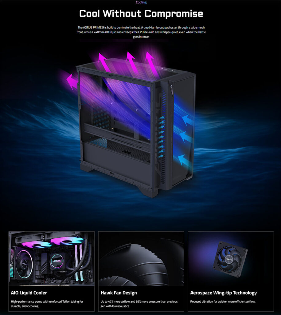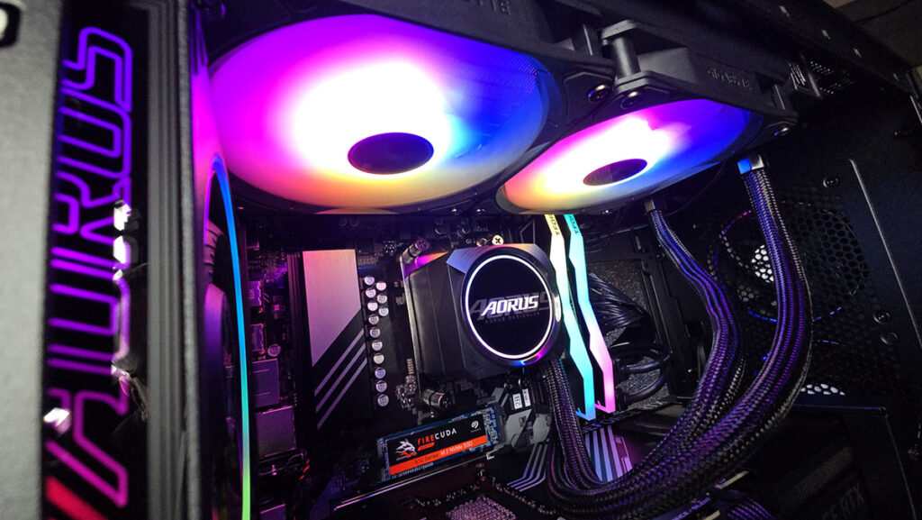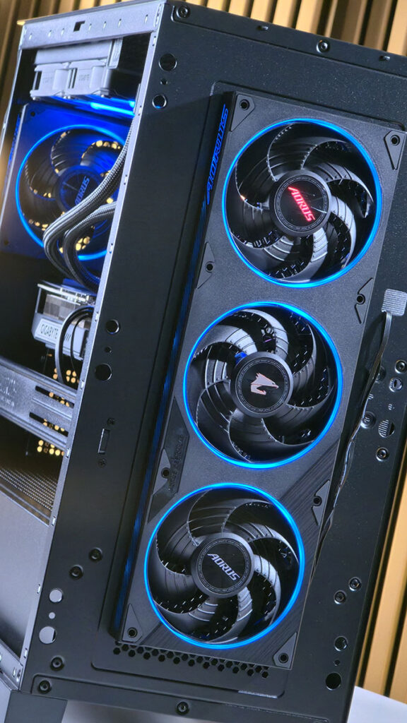Što se tiče AIR FLOW-a postavka ventilatora gde 3×120 unosi hladan vazduh u kućište, 1x120mm AORUS customizirani iznosi sa zadnje strane, a dva na AIO hladnjaku izbacuju vruć kroz radijator se čini najboljim rešenjem za ovu konstelaciju. AIO hladnjak je orijentisan malo više ka zadnjoj strani kućišta i tako prekriva kabliranje na matičnoj ploči što čini još urednijom i boljom vizuelno unutrašnjost. AIO blok pumpa ima na sebi RGB osvetljen AORUS logo, ventilatori su puni RGB sa osvetljenim lopaticama, u radu je dosta tih što ću vam pokazati kasnije kroz testove.