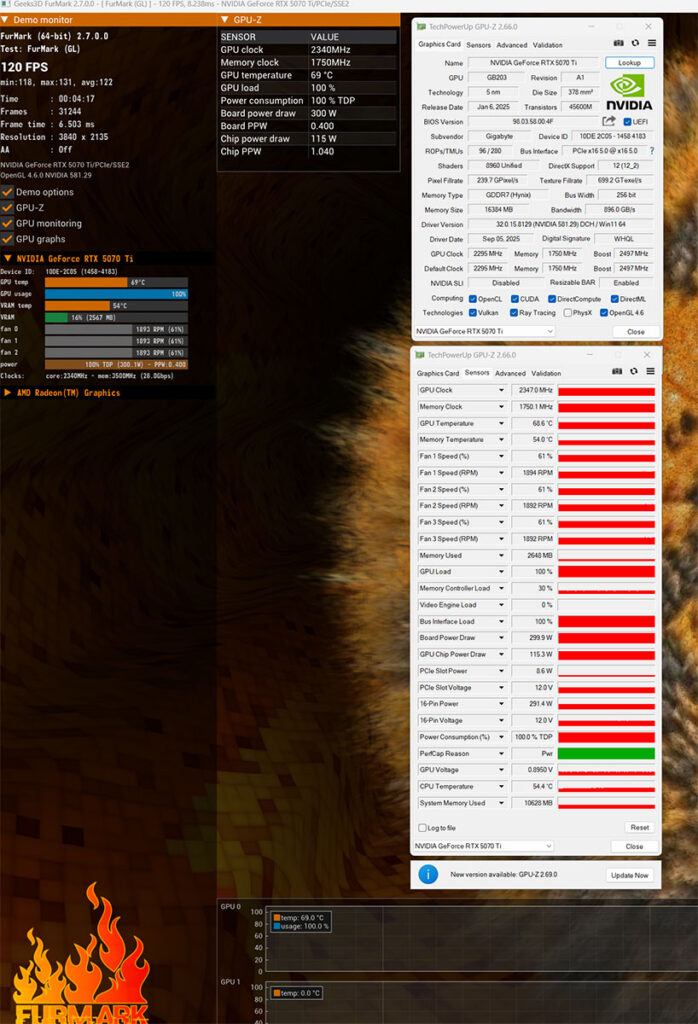 FurMark maksimalno opterećuje GPU, potrošnja GPU se kreće oko 300W, GPU jezgro boostuje na 2340MHz dok je VRAM radio na 1750MHz.
