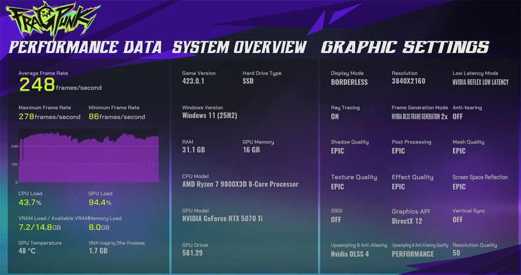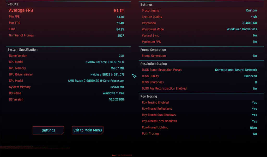 Gejming testove sprovodim kroz par igara. Naravno uz uključene funkcije kao što su Ray Tracing i DLSS uz Frame Generator, jer što bi ih imao ako ih ne koristim. Sve je uvek podešeno na MAX, a dobijeni rezultati ukazuju da je sistem zaista spreman za 4K gejming. Čak i u AAA naslovima imamo preko 60FPS.