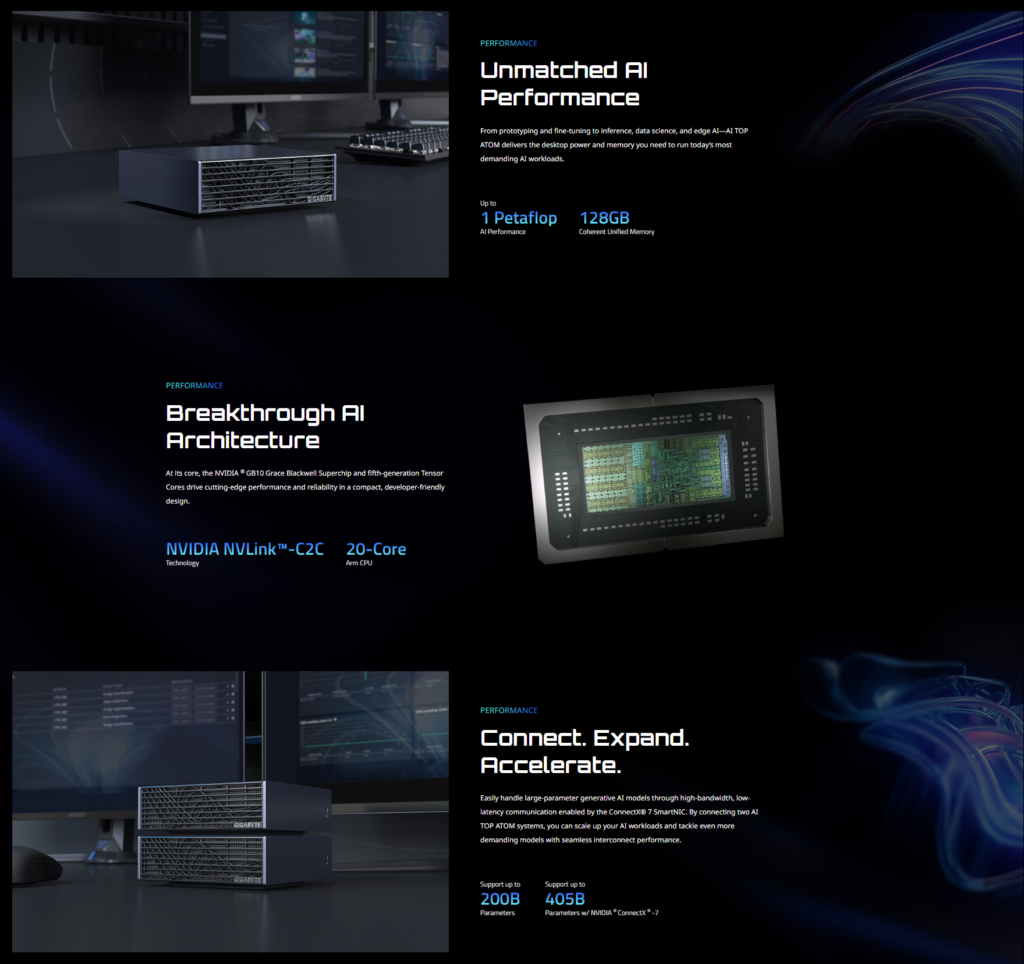 postiže do 1 petaFLOP AI performansi i omogućava rad sa modelima do 200 milijardi parametara lokalno. Za naprednije zadatke, moguće je povezati dva AI TOP ATOM sistema koji zajedno mogu obrađivati modele do 405 milijardi parametara. Uprkos ogromnoj snazi, sistem je smešten u kompaktno kućište, što omogućava neometan rad bez obzira na ograničen prostor.