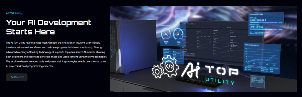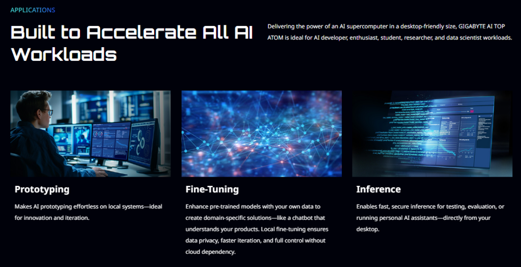AI TOP ATOM koristi NVIDIA AI software stack – kompletnu platformu za generativne AI radne zadatke, uključujući alatke, frameworke i biblioteke koje ubrzavaju razvoj veštačke inteligencije. Pored toga, sistem se besprekorno integriše sa GIGABYTE-ovim AI TOP Utility softverom, koji poseduje intuitivan interfejs za fino podešavanje modela, inferencu i implementaciju velikih jezičkih modela (LLM), multimodalnih modela (LMM) i savremenih ML aplikacija.