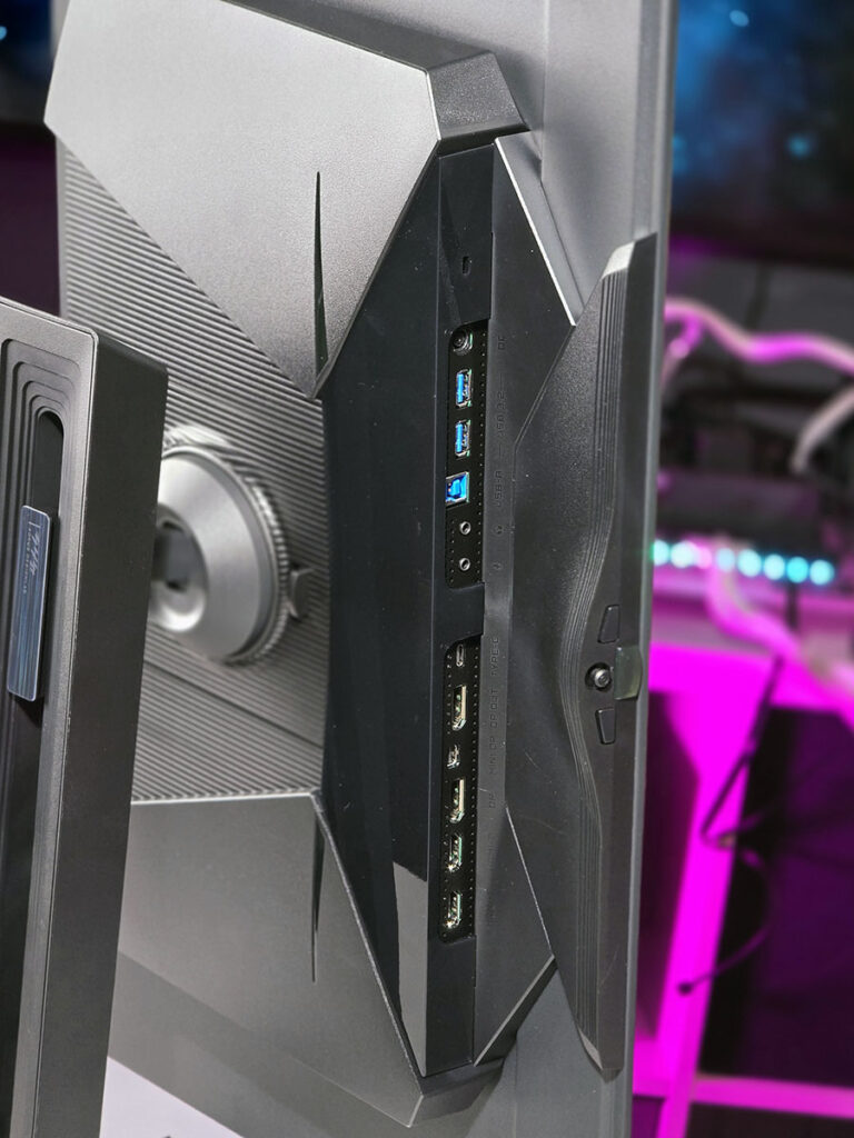 Gaming model je nesto manji i gotovo 1.2Kg lakši. Kutija je jednostavnija, uključeni su kablovi i strujni adapter kao i kod Aorus modela. Stalak je ovde nešto svedenijeg izgleda i težine, stopa je manja ali je ergonomija na najvišem nivou. Stalak je metalan ali prilikom ljuljana više se ljulja nego Aorus model. Kućište ekrana je takodje metalno a pozadina za smeštaj elektronike je plastična. Ovde jednostavno nema suvišnih elemenata, sveden dizajn ali i funkcije pa tako imamo manje konektora ali najbitnije je da su oni glavni tu. Dva komada HDMI 2.1, DP 1.4 i ovde imamo prisutan USB Type-C kako za prenos slike tako i za punjenje uredjaja i USB HUB. Tasteri za kontrolu i podešavanje monitora se nalaze sa zadnje strane što će vas naterati da malo više zavučete ruku iza kako bi ste radili na njima. Ja inače naginjem minimalizmu pa mi se ovaj Gaming model više dopada bez obzira na neke nedostatke, ali hajde da vidimo kakvi su ekrani i kakve su druge funkcije i specifikacije.