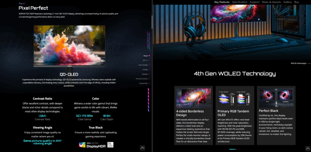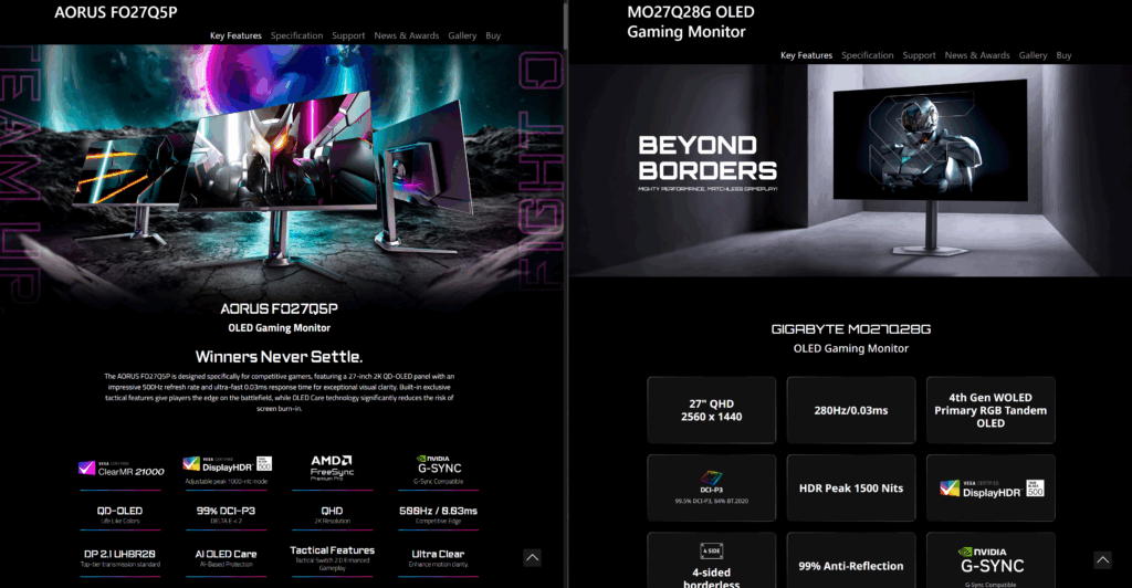 Za početak najbitnija razlika kod ova dva modela je iako su oba OLED, Aorus ima QD-OLED dok Gaming model WOLED matricu. Ukratko da vam objasnim a vi možete preko toga dalje istraživati, WOLED je više za filmove i zabavu, dok je QD-OLED za rad koji zahteva preciznost u linijama teksta i radu na softverima koji to zahtevaju. Medjutim na ekranima ove vličine to nije tako izraženo pa sam mišljenja da oba mogu proći kod svih potreba. Oba imaju podršku za NVIDIA Gsync ali Aorus model podrzava i AMD FreeSync i to premium PRO ali i VESA Clear MR21000. Oba podržavaju HDR 500 za pravu crnu, i imaju Delta E<2. Imaju KVM funkciju za lakše povezivanje miša i tastature i 99% DCI-P3. Što se tiče dodatnih gaming, oled itd funkcija to ne manjka kod oba modela, kao i uključen AI u sveri podešavanje gejming parametara.