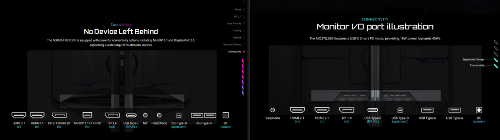 Aorus model je u kvalitetnijoj kutiji i ima više opreme. Stalak je izuzetno čvrst i stabilan. Ergonomija uključuje sve pokrete i postavke tako da tu nema omaške a konektivnost na najvećem mogućem nivou. Monitor je metalan ali je kutija za elektroniku plastična mada lepo dizajnirana a zbog silnih otvora i rešetki dobro provetrena pa će elektronika raditi na finim temperaturama. AORUS logo ima RGB funkciju a sa donje trane se nalaze konektori i to dva puta HDMI 2.1, zatim DP 2.1, mini DP 2.1, onda DP 1.4, USB Type-C za video konekciju a njime možete i puniti druge uredjaje što je idealno za povezivanje laptopa. konektori za slušalice i mikrofon ali i USB HUB. Sa donje strane je takodje i kontrolni panel za kretanje kroz meni i podešavanje monitora. Ispod ekrana je deblja lajsna ali su sa strane baze tanke. AORUS logo i jednostavno sve deluje nekako gejmerski.