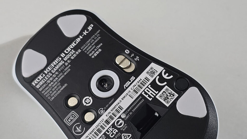 Uz miš dolazi i ROG omni receiver, a lepo je spakovan u samo kućište miša sa donje strane. Odozdo imamo i prekidač izmene načina povezivanja, kao i taster za promenu DPI.