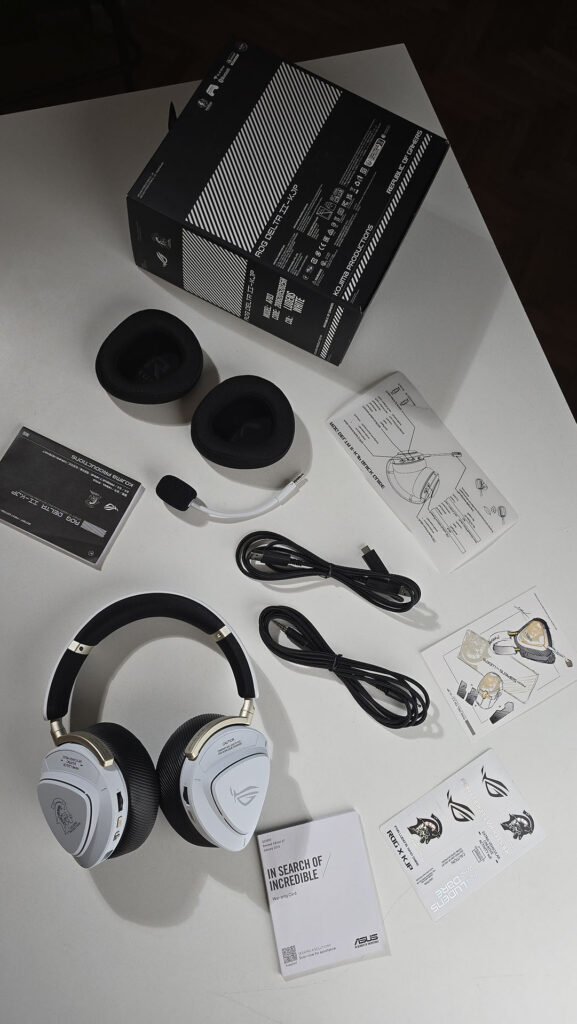 Da se bacimo redom prvo na slušalice. ROG Delta II ste već imali prilike da vidite kod nas na testu, pa da ne ulazimo ponovo u sitne detalje, posetite link ka tom videu u deskripciji. Ono čime ćemo se baviti je kako baš ove KJP izgledaju. Jasno je da je ovo najviši segment slušalica iz ROG-a. Nudi svu najnoviju zvučnu i konektivnu sposobnost, međutim detalji koji ih krase, kao ispisano unutar samih slušalica koja je leva ili desna, je nešto što se retko viđa.