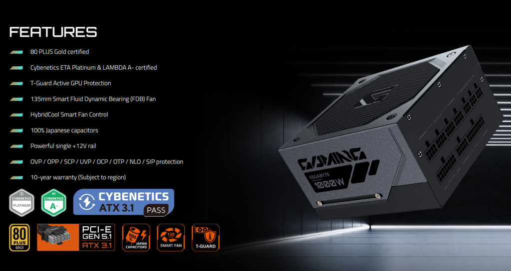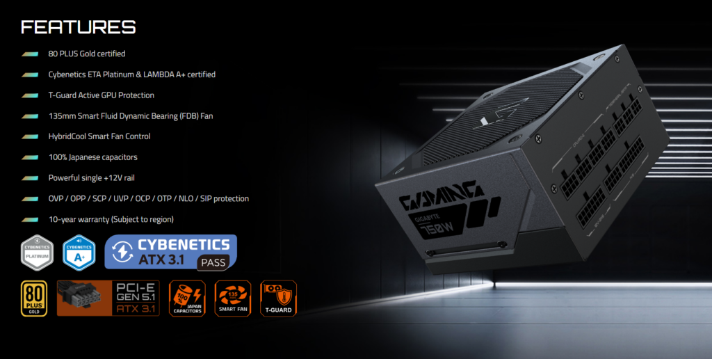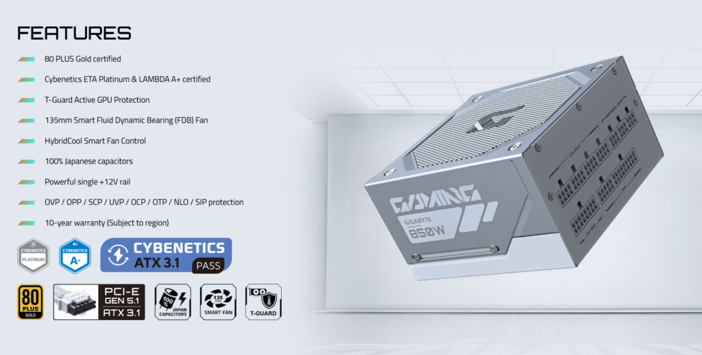 Nova GIGABYTE GAMING serija je u potpunosti usklađena sa ATX 3.1 i PCIe 5.1 standardima, dostupna u varijantama od 750 W, 850 W i 1000 W. Serija dolazi u Black i Ice izdanjima, sa 100% japanskim kondenzatorima i garancijom od 10 godina. LINK